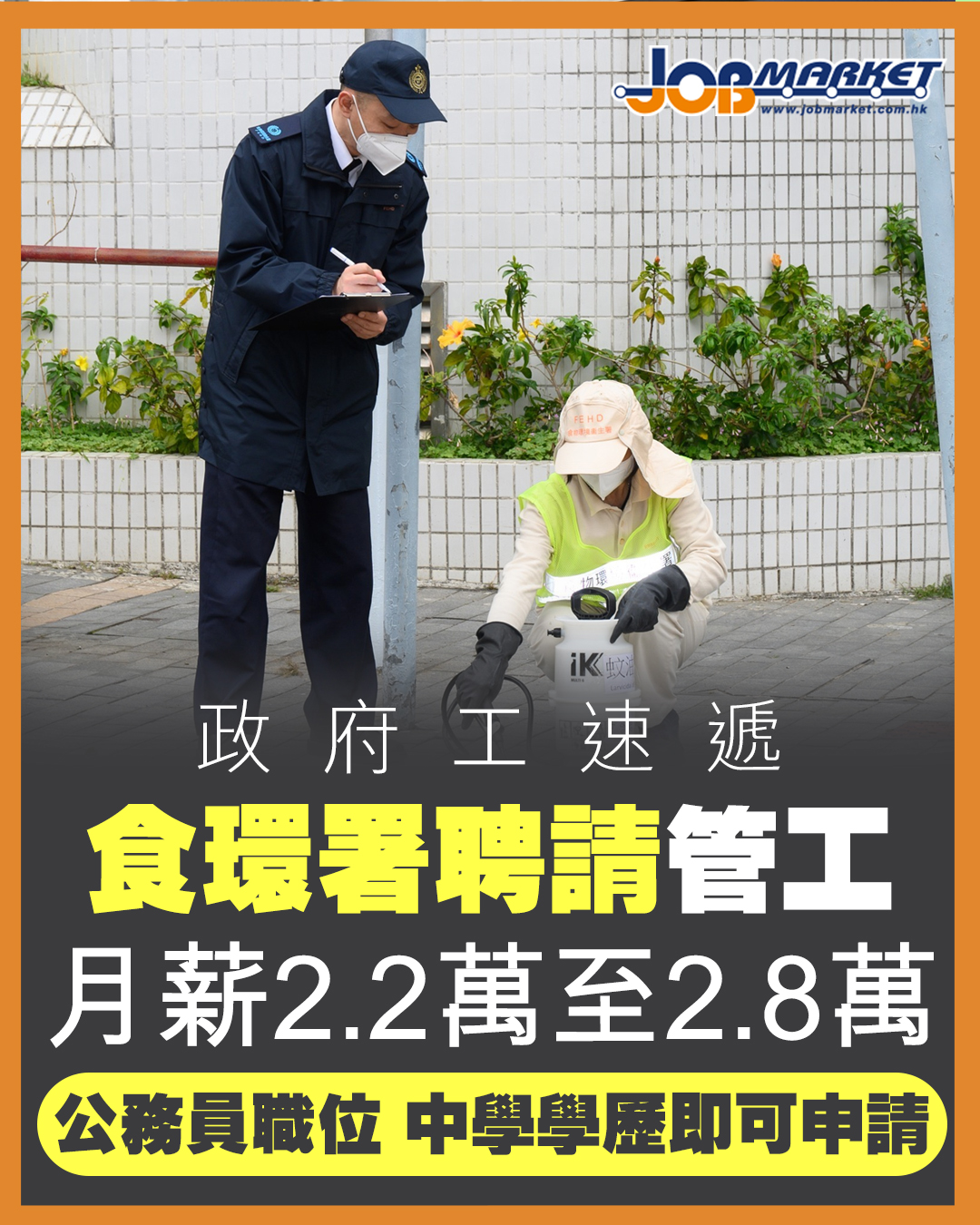 香港食物環境衞生署現正招聘管工,月薪由22,145元起,最高可達28,225元。職位主要負責前線督導及執法工作,適合具相關工作經驗並有意投身政府部門的人士申請。