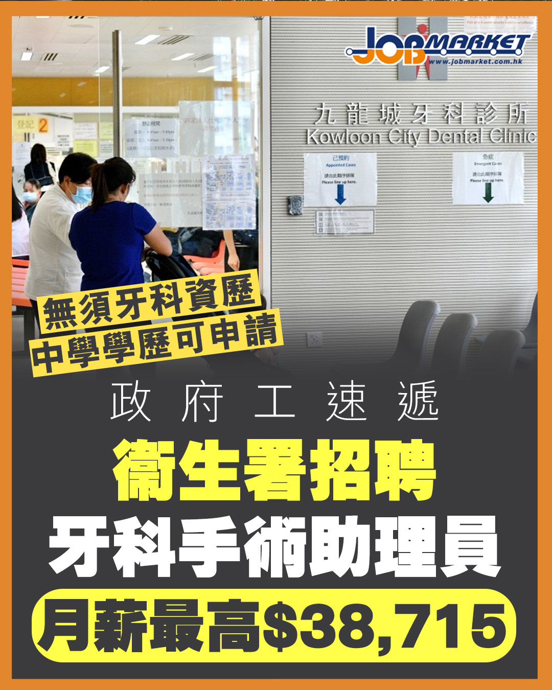 衞生署現正招聘牙科手術助理員,月薪由19,535元起,最高可達38,715元。職位主要在牙科診所協助牙醫進行治療及相關工作,適合有意投身醫療支援行業人士申請。