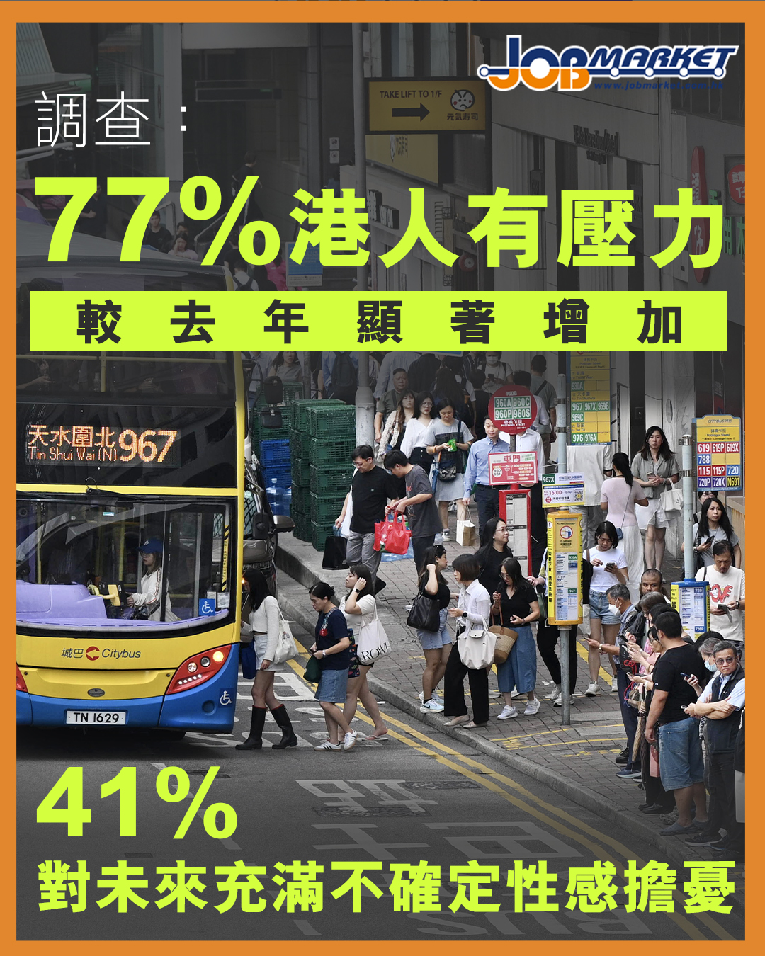 香港人的壓力水平持續上升,77%受訪者表示正感受壓力,較去年的69%顯著增加。壓力來源主要包括: