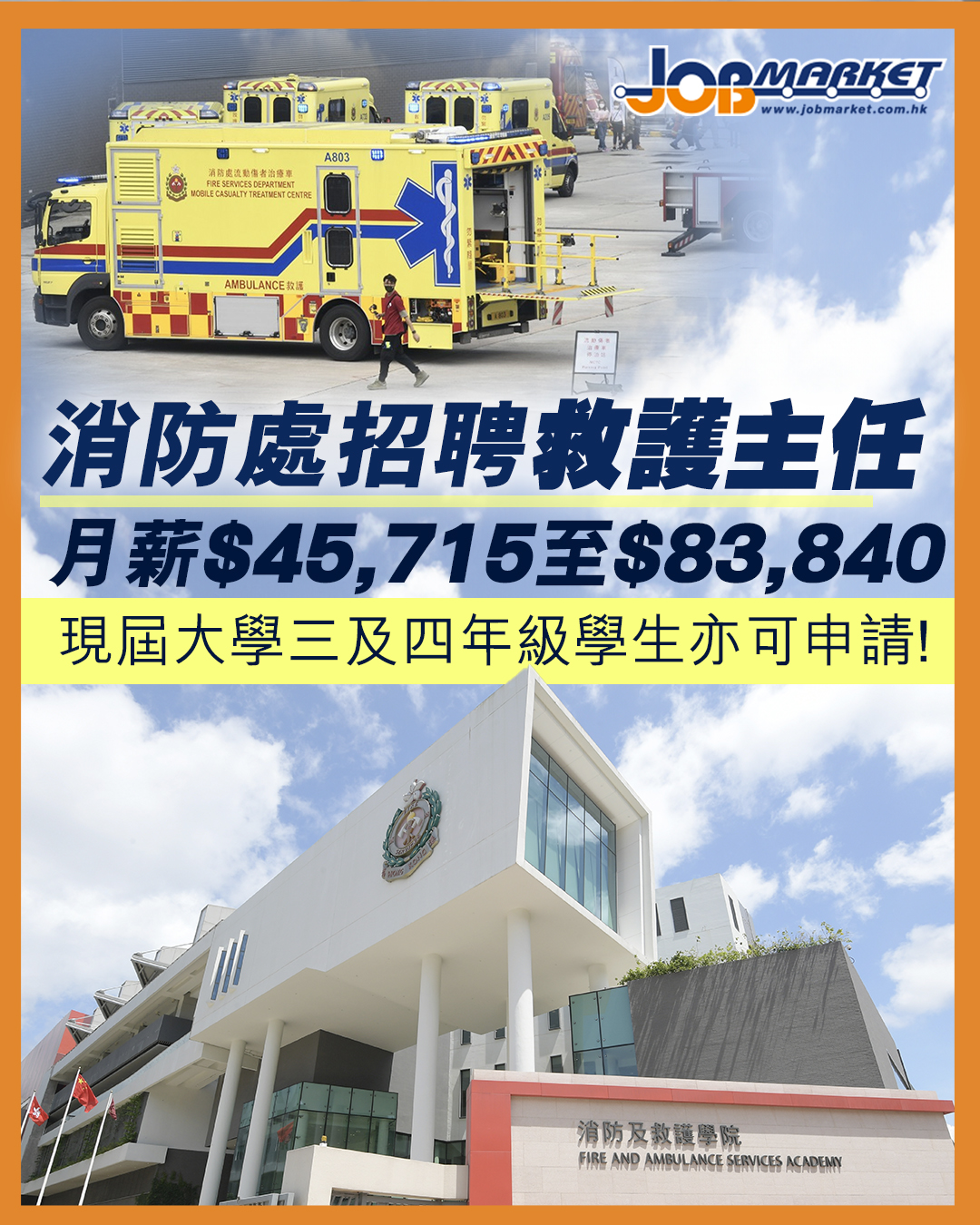 Home>職趣事>【政府工速遞】消防處招聘救護主任|月薪$45,715至$83,840 現屆大學三及四年級學生亦可申請!