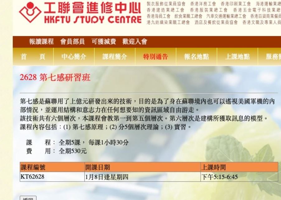 工聯會每個季度均會開辦大量課程,由幼兒興趣班、成人休閒活動、老人體能小組到就業課程都有,內容五花八門。近日就有網民被其中一個名為「第七感研習班」的課程吸引,將課程簡介資料放上社交平台後更瞬即備受矚目。