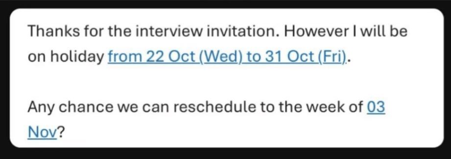 涉事的外企人事部職員21日在社交平台Threads發帖,公開一名求職者的電郵截圖,該求職者在電郵中回覆人事部表示,相約本月(10月)底的面試日期,因為撞正去旅行(on holiday),希望能改期至下月(11月)初。