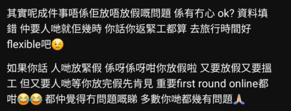 網民又普遍認為求職者只是因撞正預定旅行日期,希望另約面試時間,因此而被嘲笑似太過分:「人地咁有交帶仲想點?另外可以咁樣cap candidate既私人email 上嚟既咩?」「面試撞正去旅行,話同你改期都要畀你公審?想點?」