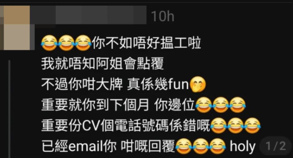 涉事人事部職員在帖文中嘲笑該求職者:「你不如唔好搵工啦。」她對於該求職者另約面試日期的理由,明顯不能接受,認為對方在「耍大牌」:「我就唔知阿姐會點覆,不過你咁大牌,真係幾fun,重要就你到下月,你邊位。」