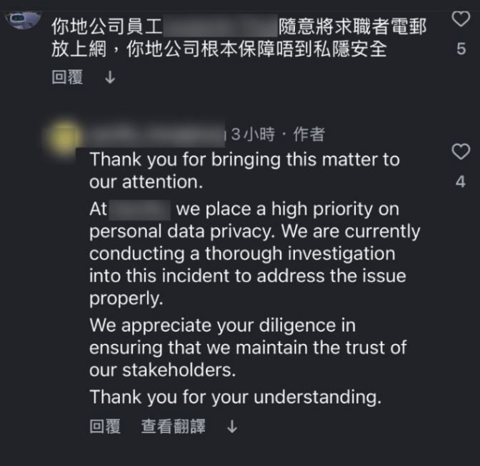 不少網民再紛紛湧向涉事外企的社交平台,作書面投訴,批評該外企公司職員涉嫌洩露求職者資料。涉事外企回覆在部分網民投訴表示,高度重視個人資料私隱,目前正對此事件進行全面徹底的調查。