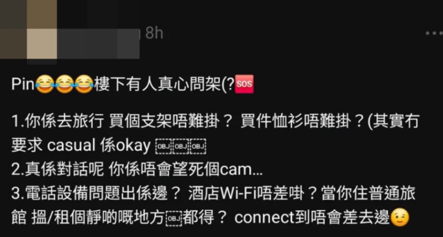 她又表示,首輪面試其實是網上(online)面試,其實旅行途中亦可進行,「你係去旅行買個支架唔難掛?買件恤衫唔難掛?......又要旅假又要搵工......仲要first round online都咁,都仲覺得冇問題嘅睇,多數你哋都幾有問題。」