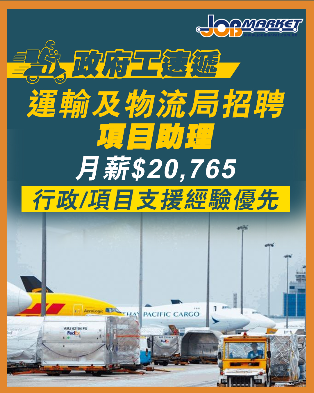 運輸及物流局(民航運輸及機場發展組/港口發展組及人力資源分組)現正招聘項目助理,屬非公務員合約職位,月薪$20,765。職位主要支援獎勵或資助計劃、項目及會議籌辦,適合具行政或項目管理經驗的人士申請。