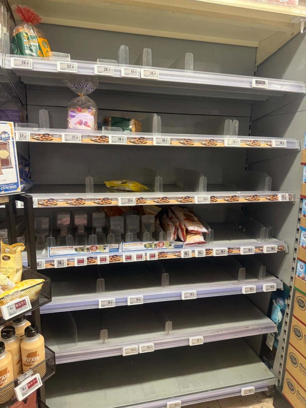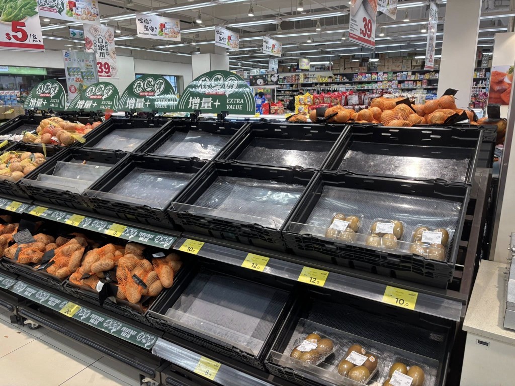 部分打工仔抱怨「收工先買已經乜都冇」,形容超市出現「不正常現象」。不少網民在社交平台貼出相片,見到貨架空空如也,形容場面宛如「The Day After Tomorrow」末日電影情節。