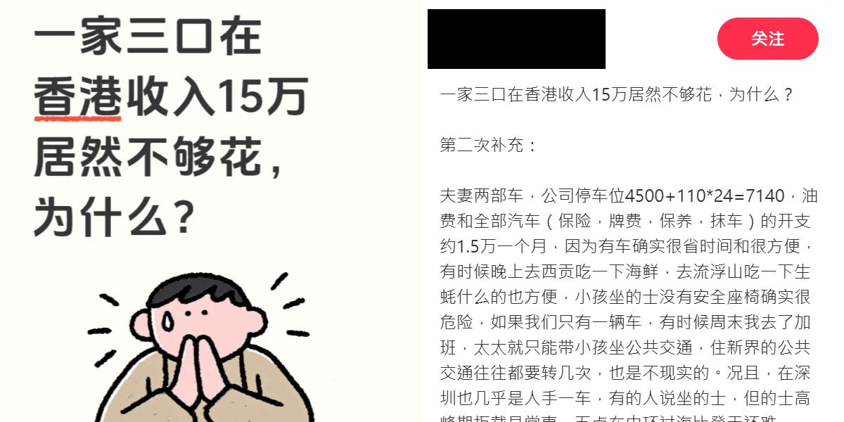 近日,小紅書上一則帖文引發熱烈討論。一名港漂人士分享自己的生活經歷,坦言一家三口在香港月入十五萬元,但每個月依然「冇錢剩」,原因是各類開支實在過於龐大。