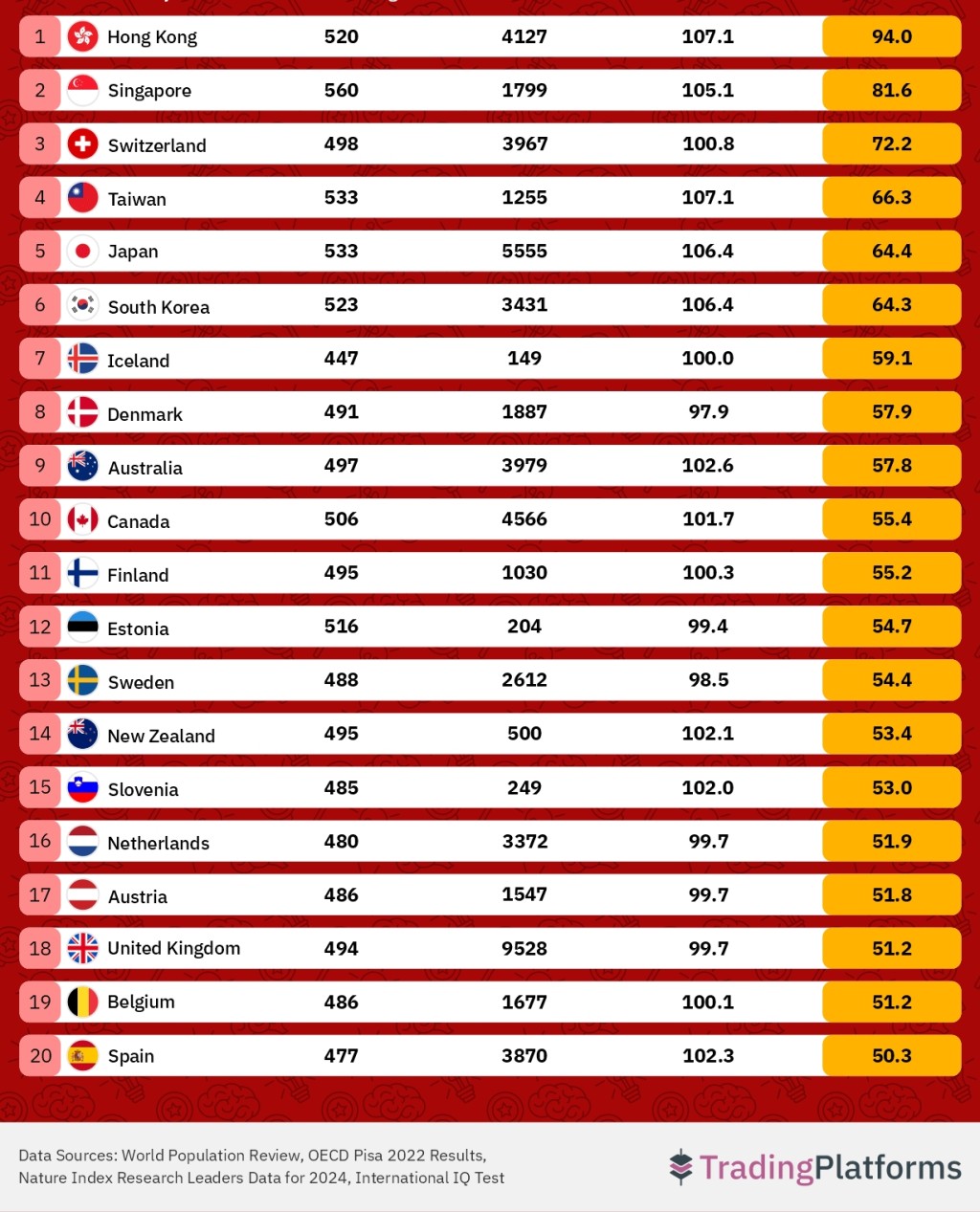基於這些因素,香港學生以接近滿分的94分,位居全球最聰明榜單冠軍,其科學研究產出領先全球,平均每百萬居民發表548.5篇科學論文。