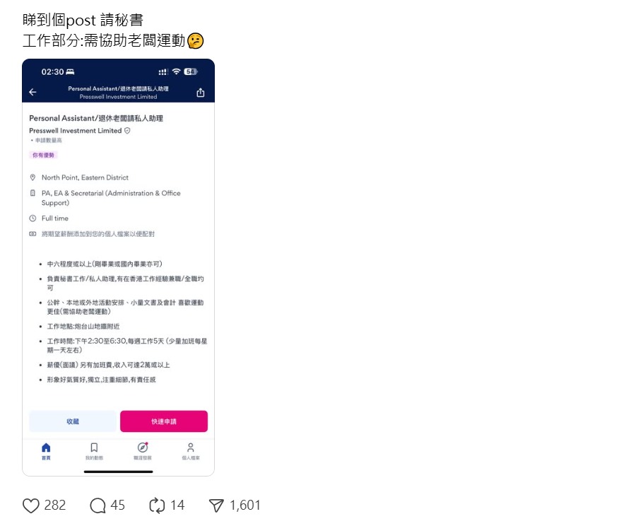 最近,有網民於社交平台上載一張求職網站職位空缺的截圖,表示「睇到個post請秘書」,惟其中一項工作內容為「需協助老闆運動」,令他感到非常好奇,更引起一眾網民留言討論。