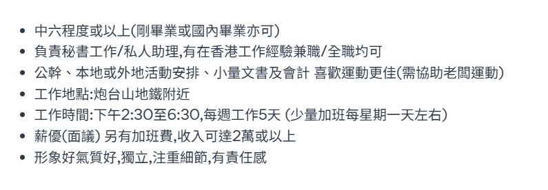 翻查求職網站資料,該公司招聘的職位為「退休老闆私人助理」,學歷要求為中六程度或以上,以及有在香港的工作經驗(兼職/全職均可),另注明對求職者的外表及性格要求,包括「形象好氣質好」、「獨立」,「注重細節」及「有責任感」等。