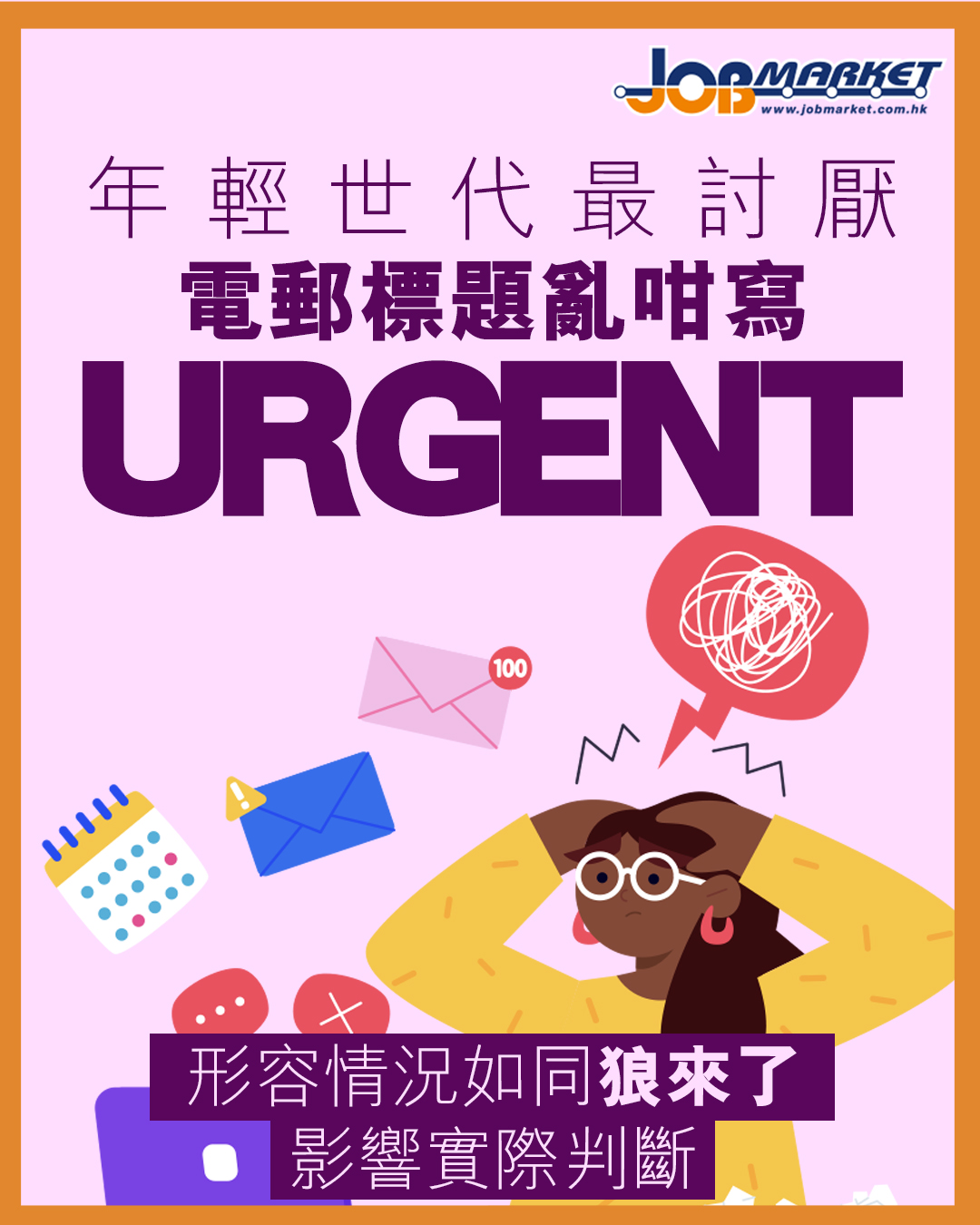 她透露,自己每日平均會收到約30封主旨標示為「URGENT PLEASE HELP」的電郵,認為若所有事項均被定義為緊急,反而削弱真正急件的辨識度,形容情況如同「狼來了」。她指出,長期在高度緊迫的工作狀態下,容易令人感到疲累,下班後亦難以抽離工作狀態。