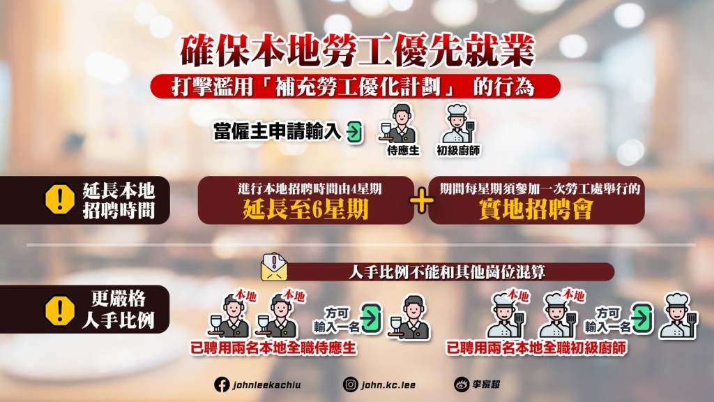 · 僱主申請輸入侍應及初級廚師,須先進行6星期本地招聘(由原本4星期延長),並每周參與一次勞工處招聘會。