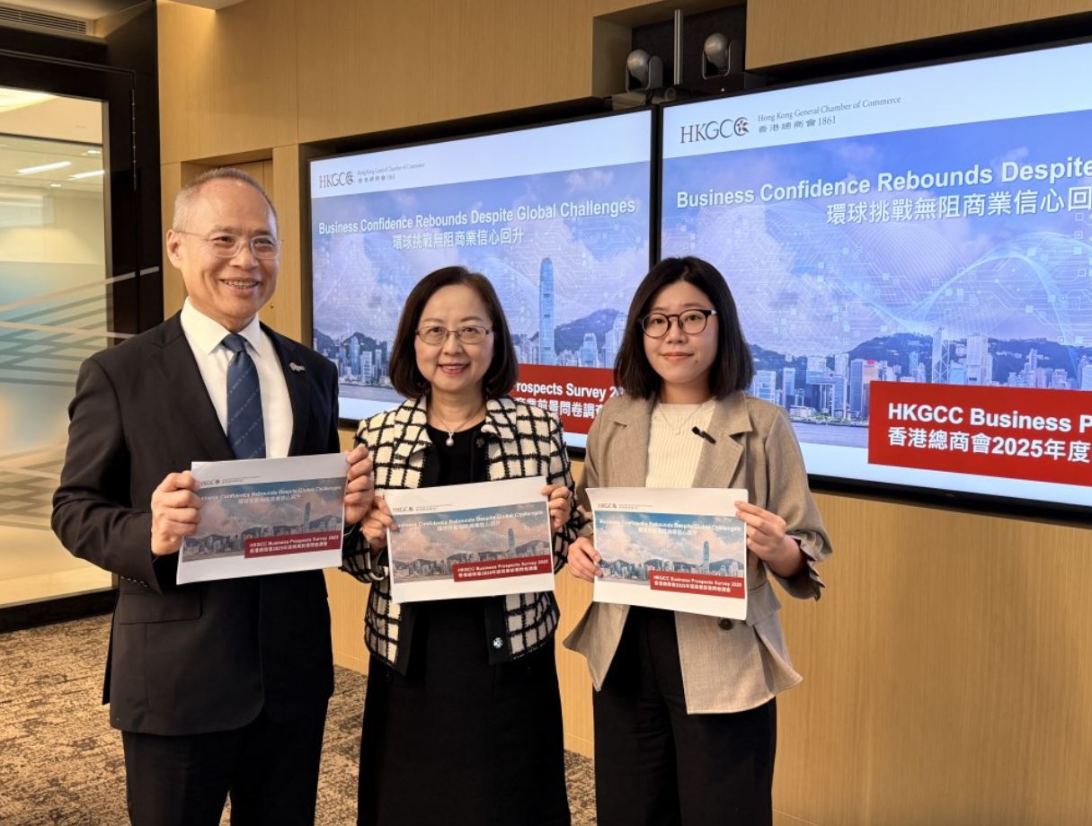 香港總商會今日(11日)公布「商業前景問卷調查」,結果顯示有48.3%受訪企業對本港未來12個月的經濟前膽表示正面,較去年的18.3%大幅上升1.7倍,總商會認為這是受到中美暫緩關稅、以巴和平談判取得進展等影響,令到信心指數上升。總商會更預料本港今年實質經濟增長3.2%,明年放緩至2.7%,展望未來認為本港經濟具備優勢,同時亦存在隱憂。