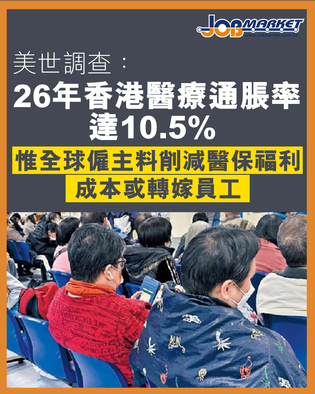 人力資源諮詢公司美世達信員工福利(Mercer Marsh Benefits)最新發布《2026年健康趨勢》(Health Trends 2026)報告,顯示明年香港醫療通脹費率預計達10.5%,雖較今年下降0.5個百分點,但仍是本地預期通脹(2.2%)的近五倍,意味著員工醫療保險成本將繼續錄得雙位數增長。