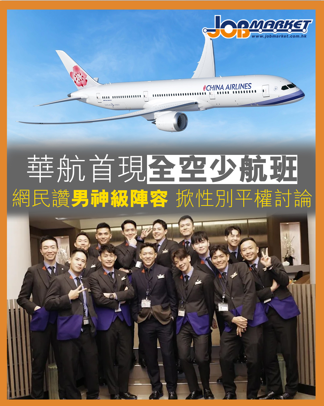 中華航空近日出現極具話題性的「全男性空服員」班組。11月13日 CI012 台北飛紐約、以及11月18日返程航班,由 15 名男性空服員全隊執勤。他們於桃園機場整齊步出時即刻吸引旅客眼光,照片傳到網上後迅速爆紅,不少網民笑稱是「男團級航班」,亦有旅客形容整個旅程「驚喜又難忘」。這次配置亦成為華航自 1938 年成立以來首度「全空少」陣容,被視為航空界性別平等的重要突破。