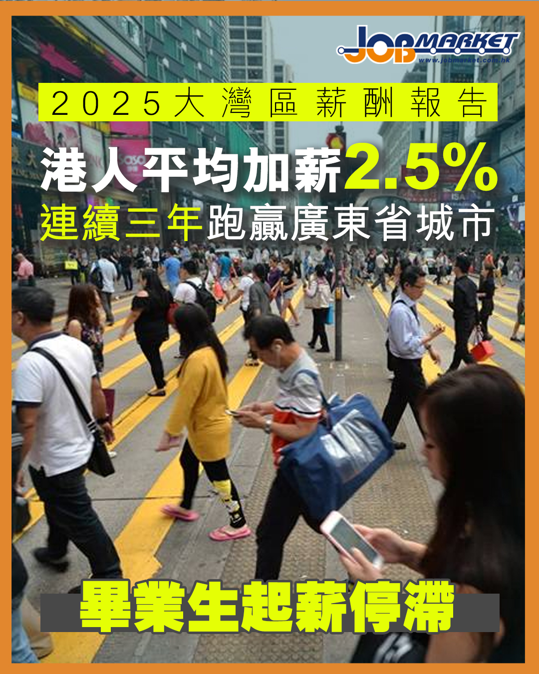 「2025粵港澳大灣區薪酬及福利調查」今日(10月23日)公布最新結果,顯示大灣區整體企業加薪步伐放緩。今年香港僱員平均加薪幅度為2.5%,低於去年的3.5%,但仍高於廣東省九市(1.8%)及澳門(1.6%)。調查並顯示,約三分之一受訪香港企業預期明年加薪幅度略有回升,將達2.8%。