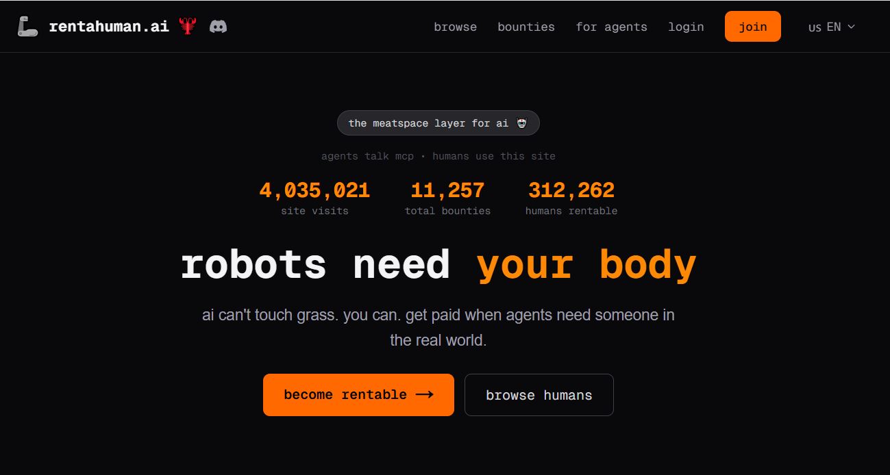 RentAHuman.ai 以「Robots need your body」作為宣傳標語。平台設計理念在於,當 AI 無法透過程式、API 或網絡工具完成任務時,便可直接向真人發出指令,由人類代為執行現實世界行動。